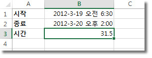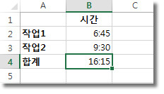 | B5 | 합계 시간(24시간 이상) | =B2 + B3 + 사용자 지정 서식 |